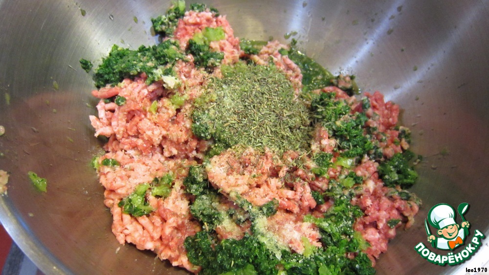 В качестве начинки можно использовать различные варианты. У меня - фарш из остатков свинины, которые мы срежем в процессе подготовки "короны", с добавлением шпината, остальной зелени, яиц и сухарей.