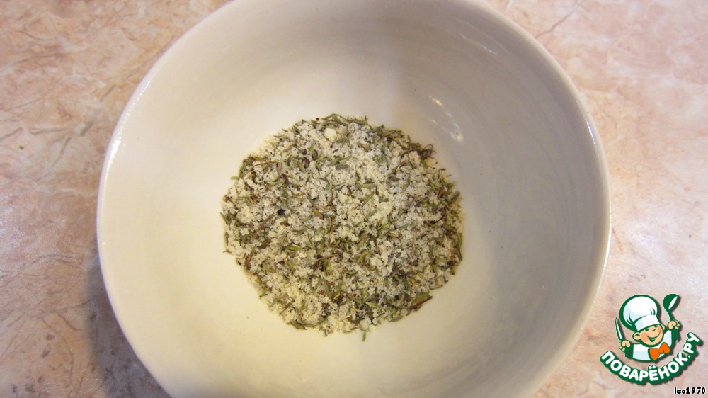 Смешайте оставшуюся соль, тимьян и перец. Этой смесью натрите "корону со всех сторон (в принципе, натереть мясо можно заранее).