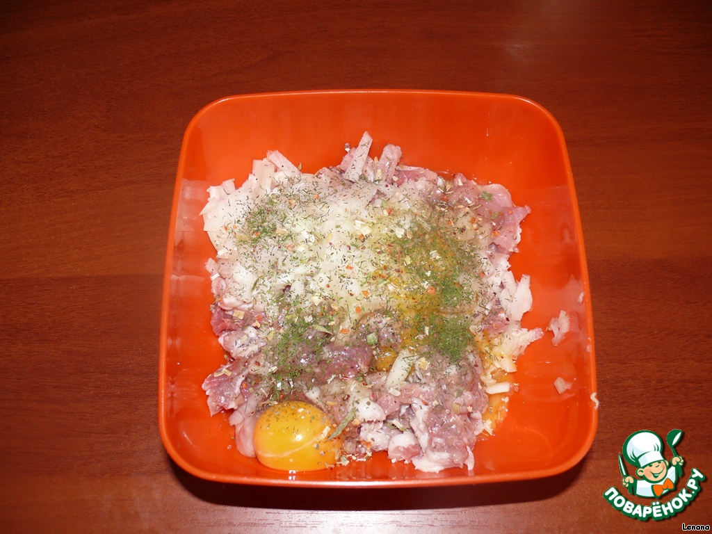 Берем свиную шейку, моем и нарезаем в глубокую тарелку небольшими кубиками (некоторые режут полосками, но испробовав оба варианта, пришла к выводу - кубики лучше прожариваются и если у вас, например, как у меня, есть маленькие дети, то им кубики легче кушать), затем нарезаем репчатый лук 2 шт (если они небольшие. Если луковица большая, то на 500 гр. свинины я обхожусь и одной), разбиваем яйца, после чего добавляем специи (у меня это обычно "вкусная соль 12 трав" и смесь из 5 перцев, но немного).