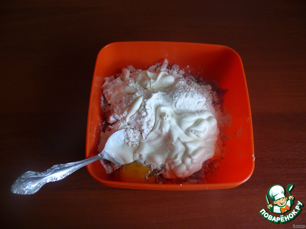 Добавляем 4 ст. ложки муки (именно муки, вариант с крахмалом мне лично на вкус не очень нравится), майонеза где-то 100 грамм, лучше добавлять по-немногу, чтобы не получилось жидко в итоге.