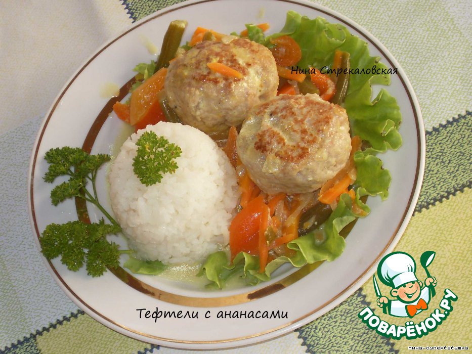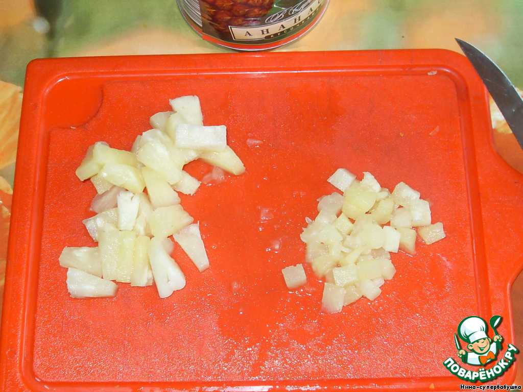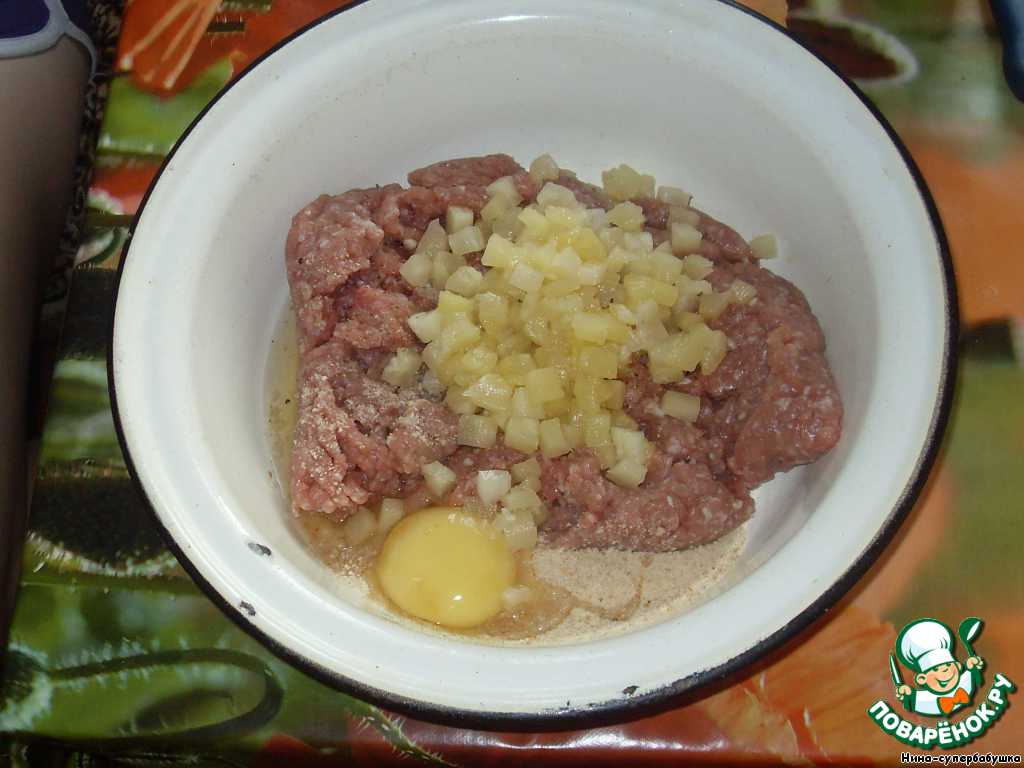 Фарш смешать с сухарями, яйцом, обжаренным кунжутом и кусочками ананасов. Добавить соль и перец по вкусу.