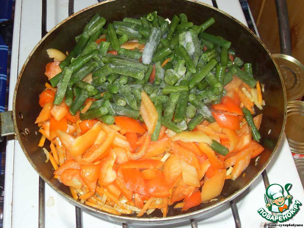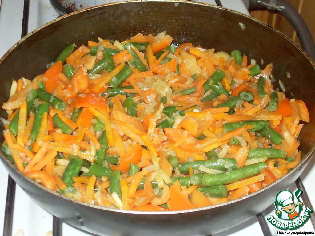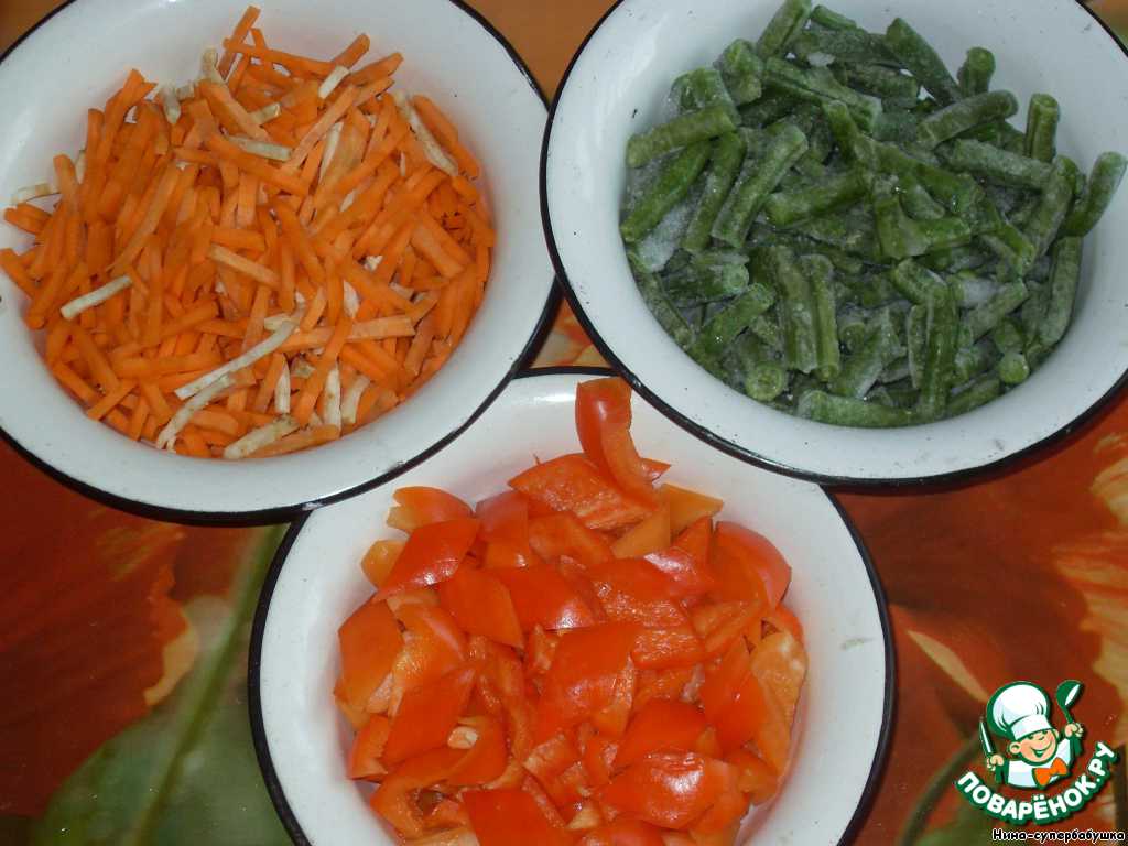 Морковь очистить и нарезать соломкой. У меня еще завалялся в холодильнике небольшой кусочек корня сельдерея - тоже пустила в дело. Перец очистить, нарезать полосками и затем ромбиками.