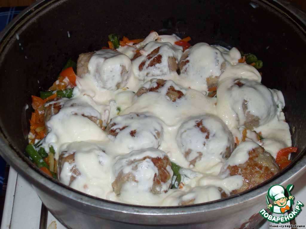 Переложить овощи в глубокий сотейник или жаровню, к овощам выложить тефтели.