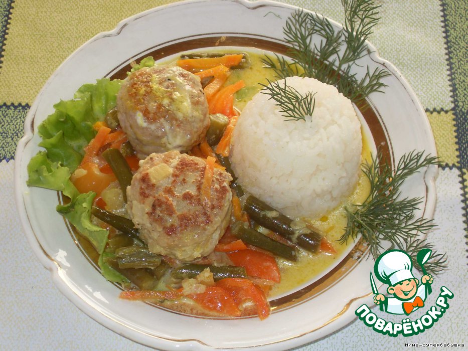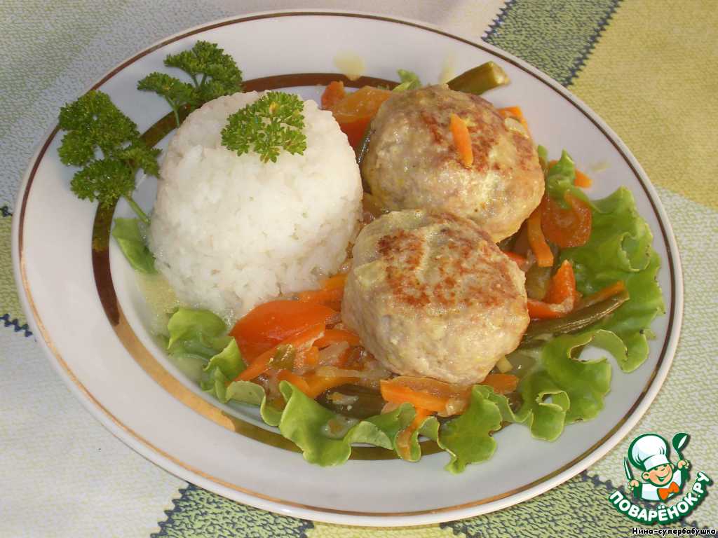 На лист зеленого салата выложить овощи, а сверху тефтели. Подавать с рисом, украсив зеленью.