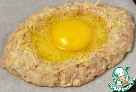 В каждую «ямку» разбиваем яйцо. Сделать это нужно аккуратно, чтобы белок не перелился через край. Вокруг желтка снова посыпаем сыром. Если у вас все-таки убегает белок, как один раз получилось у меня, разбивайте яйцо отдельно в тарелку и аккуратно столовой ложкой выбирайте желток с частью белка и помещайте в ямку.
