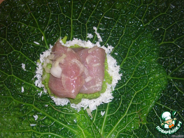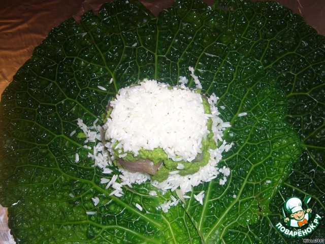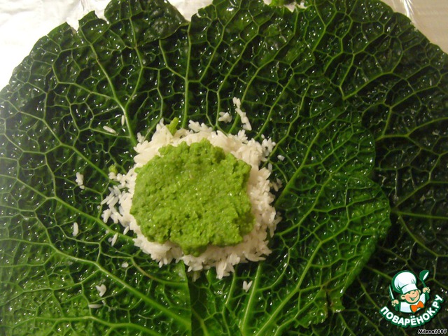Разобрать капусту на листы, облить их кипятком, выложить на два капустных листа 50 г риса.