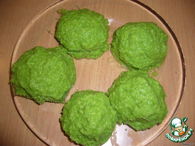Зеленый горошек разморозить, измельчить, добавить соль, скатать в шарики.