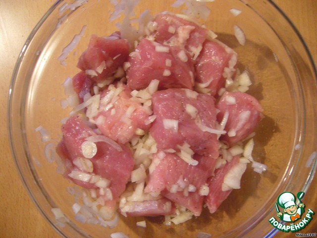 Мясо нарезаем большими кусками, лук нарезать кубиками, все посыпаем солью, перцем, оставляем мариноваться на несколько часов.