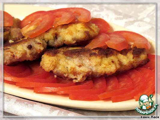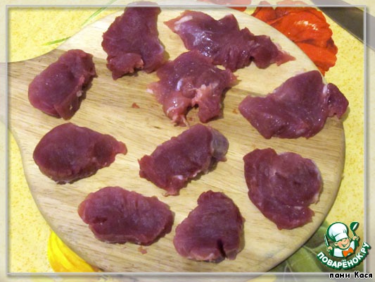Нарезать свинину на "медальоны", отбить, посолить, посыпать приправой.