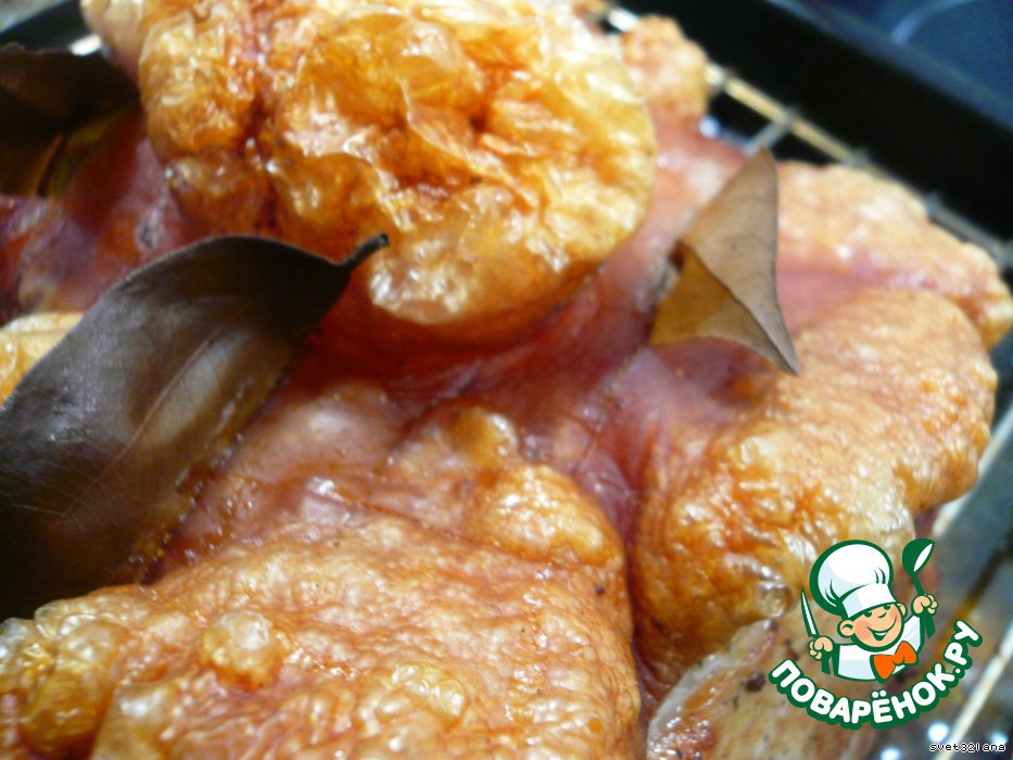 Вытаскиваем из воды, натираем со всех сторон мясо солью, перцем и тмином. В прорези шкурки вставляем листики лаврушки. Кладём мясо на решётку, решётку на противень, в противень наливаем 1,5 стакана воды.
