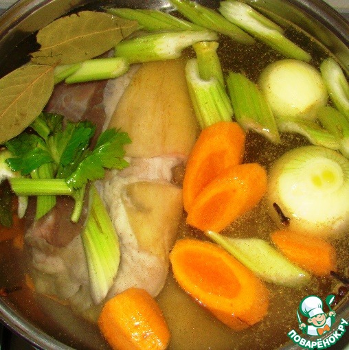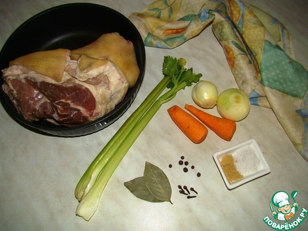 В большую кастрюлю укладываем рульку, крупно нарезанную морковь, лук целиком и приправы. Заливаем водой, чтобы она полностью покрывала рульку. Солим. Доводим до кипения и убираем пену. Варим на медленном огне 2,5-3 часа. Даем остыть рульке в бульоне.
