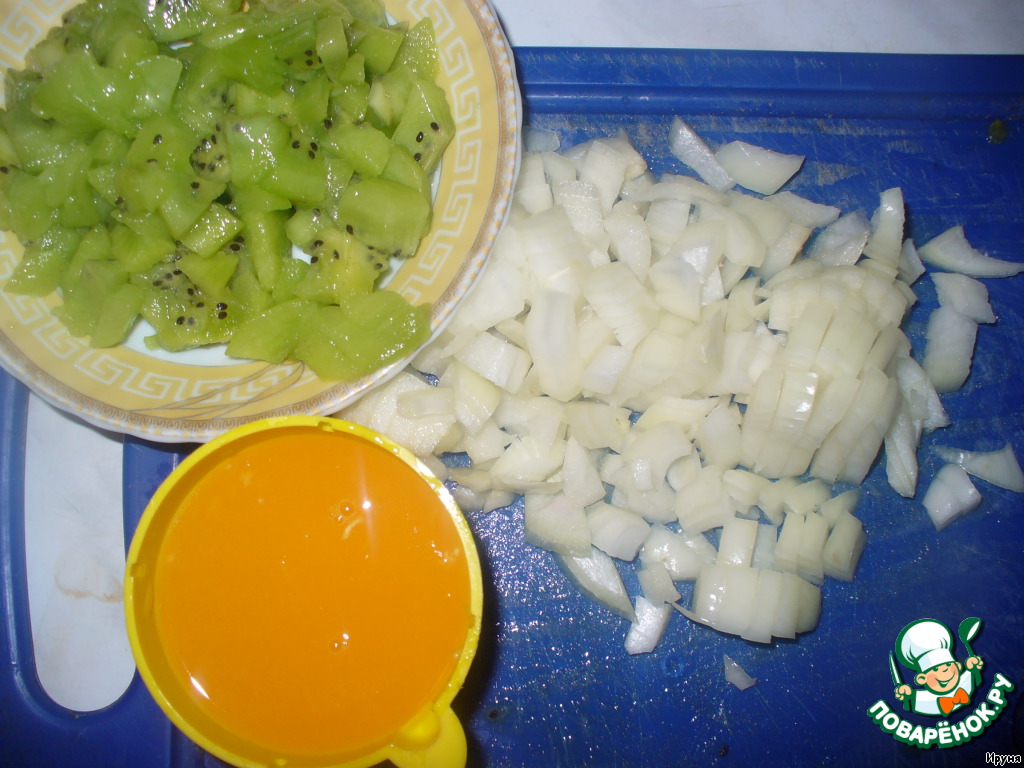 Киви и лук чистим, режем мелкими кубиками. Если используем свежевыжатый апельсиновый сок, то выжимаем его из апельсина.