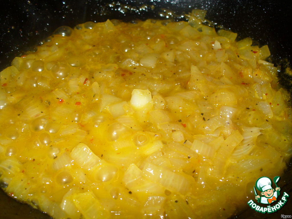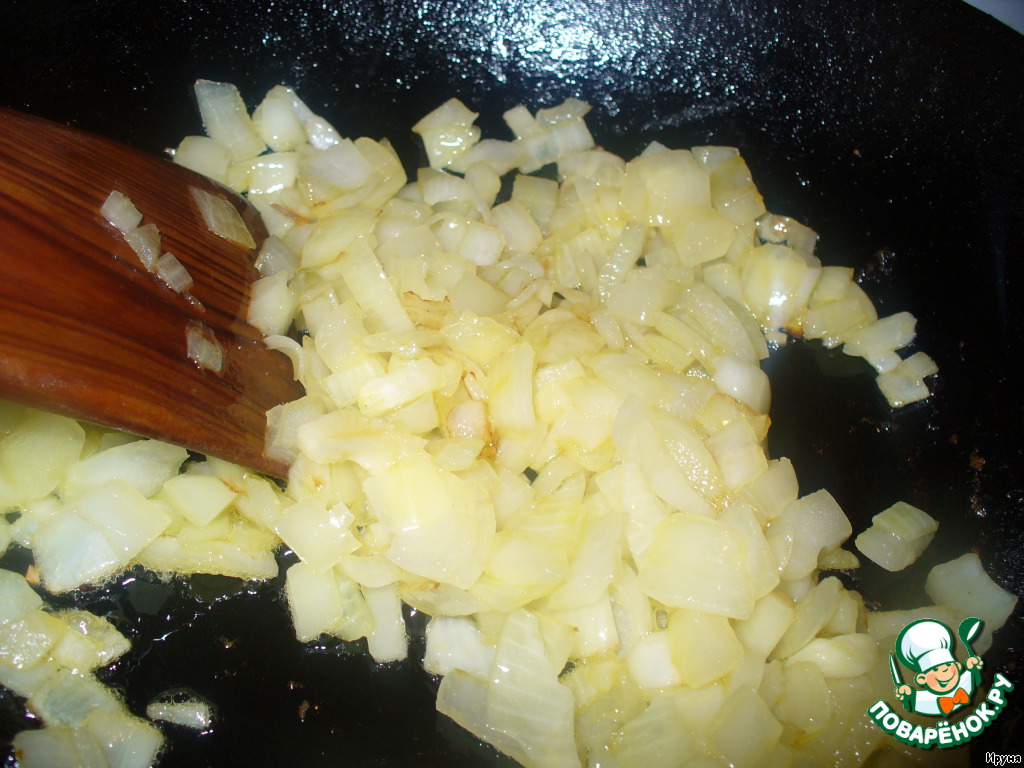 На сковороде растапливаем сливочное масло и пассеруем в нем лук до прозрачности.