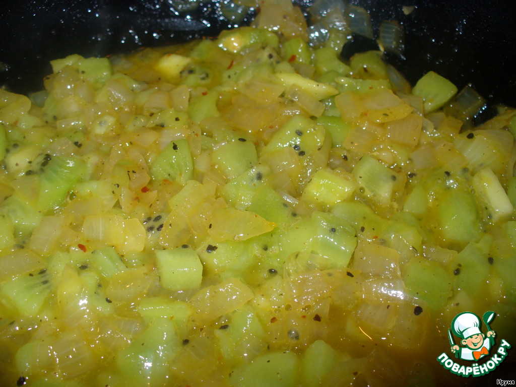 В сковороду, где бульон, добавляем содержимое сковороды с киви, хорошо перемешиваем, приправляем по вкусу солью, перцем черным и красным.