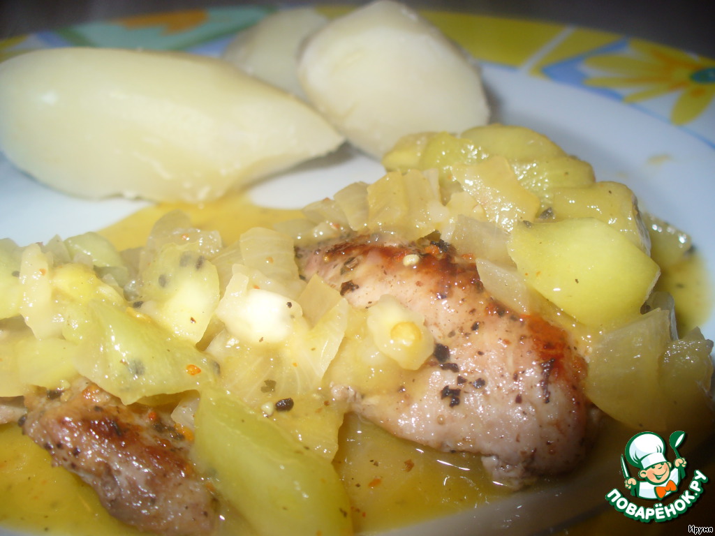 Куски свинины слегка отбить, посолить, поперчить и обжарить с обеих сторон на растительном масле (на другой сковороде), по 4 мин. с каждой стороны. До готовности!