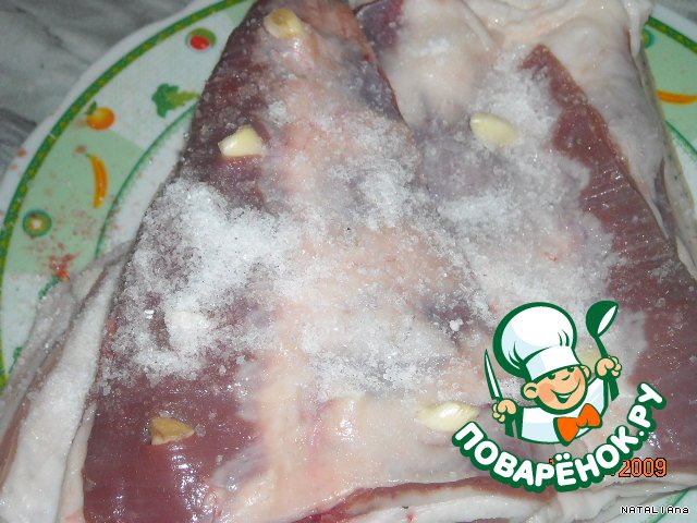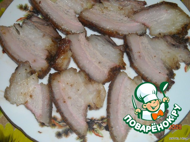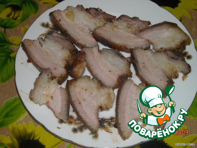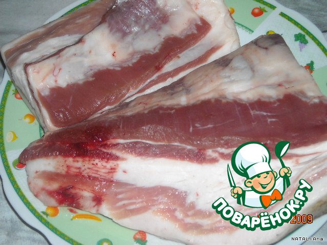 | Мой муж очень любит сало... А если оно с прослойкой мяса... ммм... Запекла ему подчеревку. Подчеревка - это мясо брюшины. "Черево" - по украински "брюхо". Это сало с мясом вперемешку, слоями где-то по 1-2 см толщиной. Самая вкусная часть у свиньи, по его мнению. |