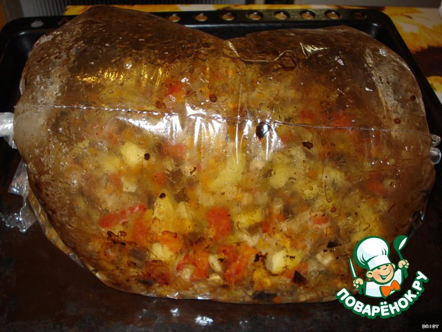Свинину порезала небольшими кусками. Смешала столовую ложку меда и столовую ложку горчицы. Посолила, поперчила, обмазала горчицей с медом и положила в холодильник (часа на 2, я оставила до следующего вечера). Купила 2 упаковки замороженных овощей «Овощное рагу» («4 сезона»), в состав смеси входит баклажан, перец, помидор, морковка, лук. Если нет такого рагу, как купила я, можно взять любое. А можно самой подготовить любой набор овощей, но мне очень удобно брать именно замороженные, ничего не успеваю. Почистила картошку и порезала мелкими кубиками, так же, как порезаны овощи в пакете. Не знаю, правильно ли сделала, но перед приготовлением блюда я горчицу с мяса смыла и промокнула мясо, чтобы не осталось воды. Перемешала все в миске, посолила, посыпала сушеным базиликом. Затем все сложила в рукав, туго завязала с 2 -х сторон. Положила на противень, поставила в заранее разогретую духовку на 40 минут. И ВСЕ! Очень интересно было наблюдать, как пакет надулся, сначала внизу было много жидкости, а потом она вся впиталась. Получилось очень вкусно. Готовишь совсем без масла, хотя свинина у меня была совсем постная. Противень чистый, посуды испачкала мало. Я не собиралась размещать рецепт на сайте, поэтому фотографий мало.