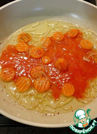 Пассеруем на оливковом масле пару минут, добавляем томатную пасту (у меня домашний томат).