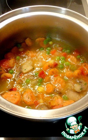 Оставшуюся зажарку переливаем в кастрюлю, доводим до кипения. Засыпаем овощи (не размораживая).