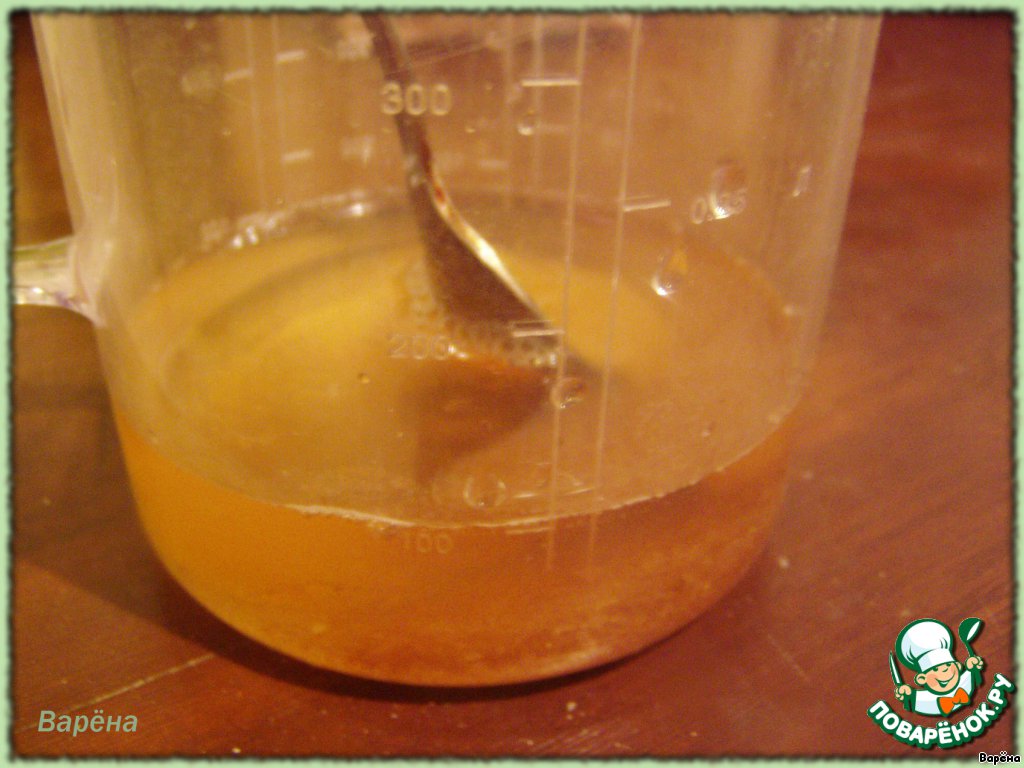 Приготовьте заливку. 2 ст.л. яблочного уксуса, 1 ст.л. тростникового сахара, 1/2 ч.л. меда смешайте и долейте водой так, чтоб объем был 100 мл.