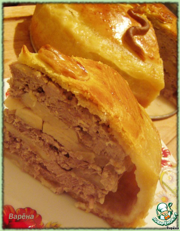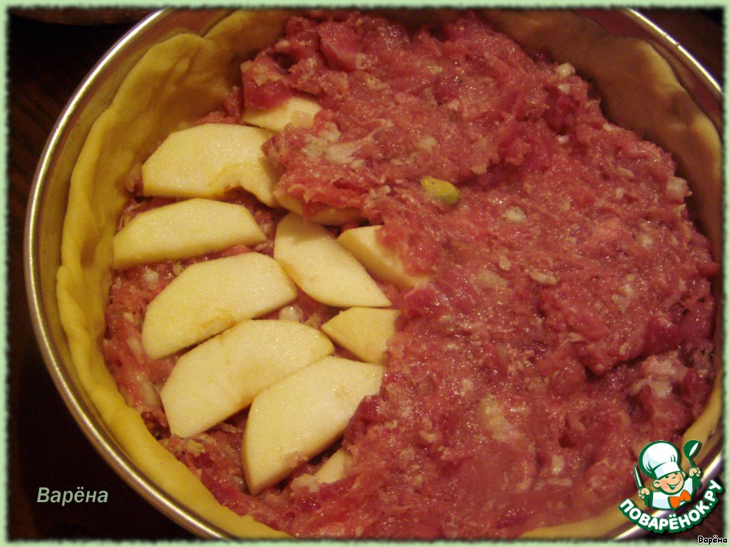 Выкладываем слоями фарш и яблоки, так чтоб последним слоем был фарш.