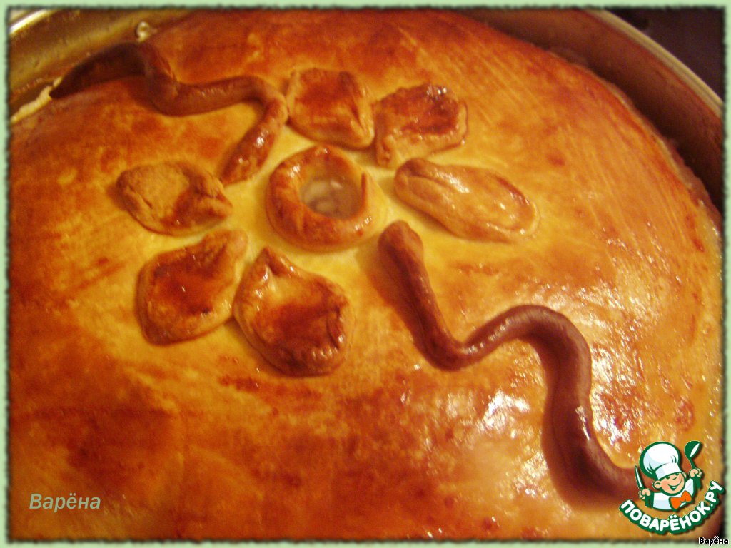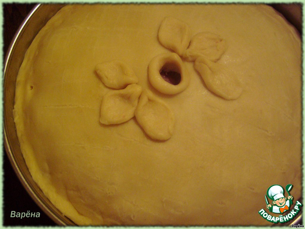 Накрываем оставшимся тестом. Делаем украшения и обязательно вырезаем отверстие для выхода пара. Верх смазываем яйцом и отправляем в духовой шкаф (190°С) на 1,5 часа.