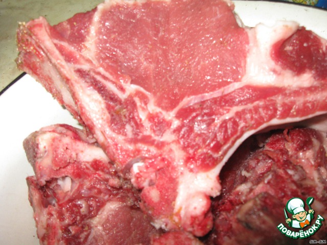 Каждый кусок натираем солью и специями, заливаем минералкой, придавливаем грузом и оставляем мариноваться часа на 4 (желательно на всю ночь)