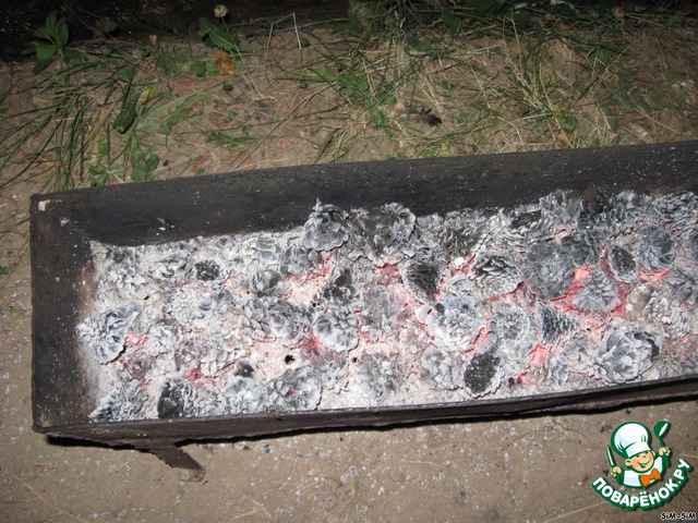 Жарим на решетках, желательно на древесном угле (мы жарили на сосновых шишках - аромат необыкновенный)