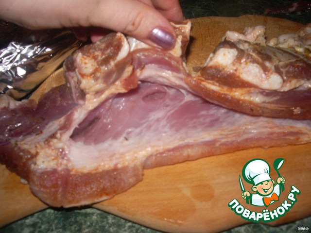 Достаем ребрышки из маринада и по прослойкам надрезаем кармашки куда складываем нашу начинку.