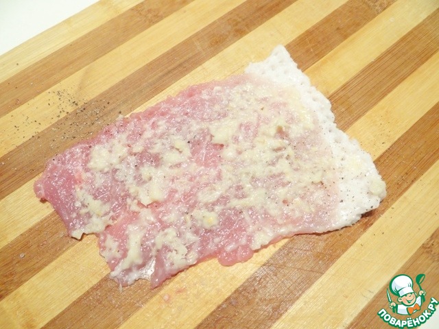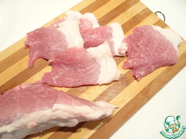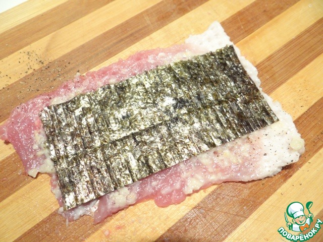 Лист нори нарезаю на прямоугольники, немного меньше самого свиного ломтика, укладываю его на мясо.