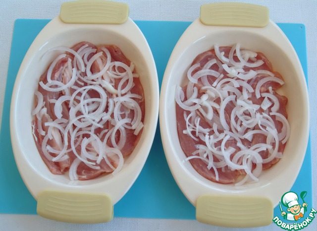 Лук почистить, помыть. Нарезать полукольцами. Разложить равномерно поверху мяса.