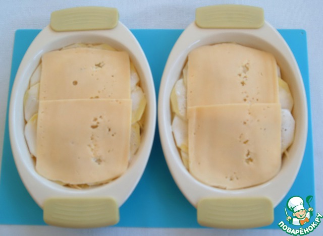 Выложить еще один слой картофеля, посолить поперчить его. Полить сливками. Закрыть картофель сыром. Накрыть форму фольгой и отправить в духовку запекаться приблизительно на 50-60 минут при 180*