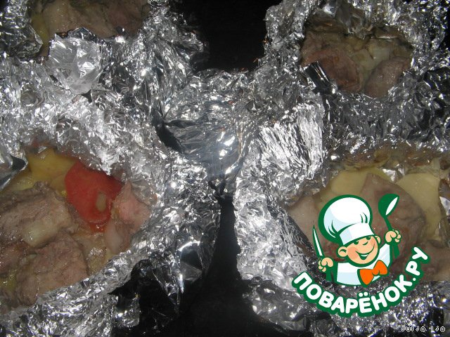 | Сочное мясо с овощами, запекается порционно в мешочках из фольги, в них же и подаeтся. Идея совсем не новая, но может кому-то пригодится. |