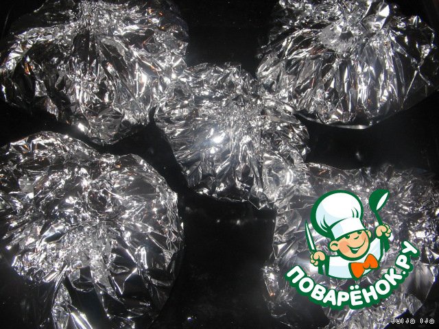 Минут за 15 до конца приготовления, раскрываем фольгу и допекаем так. При подаче украшаем зеленью.