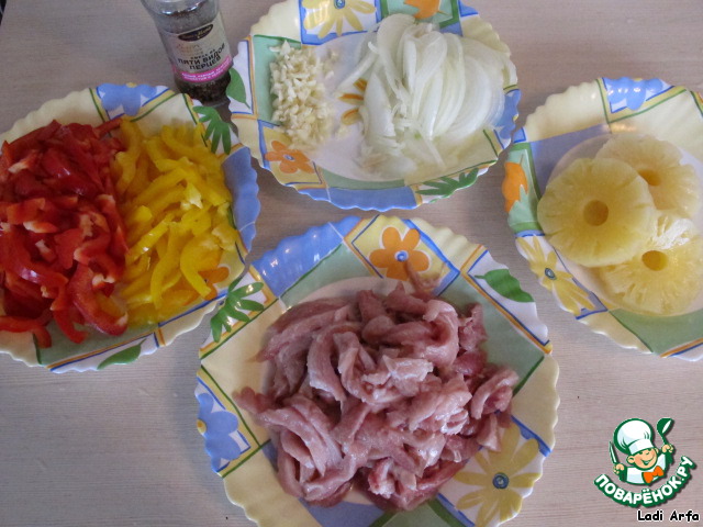 Закладываем мясо и, постоянно помешивая, обжариваем 3 минуты, после чего добавляем ананасы и обжариваем ещё несколько минут до готовности.