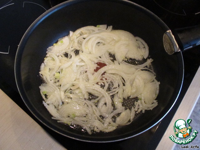 На сильно разогретую сковороду с двумя ложками оливкового масла выкладываем лук, обжариваем 1 минуту...