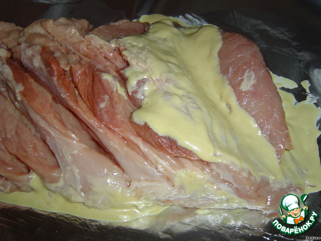 Свинину обмазываем горчично-майонезной смесью со всех сторон, а также между "листочками".