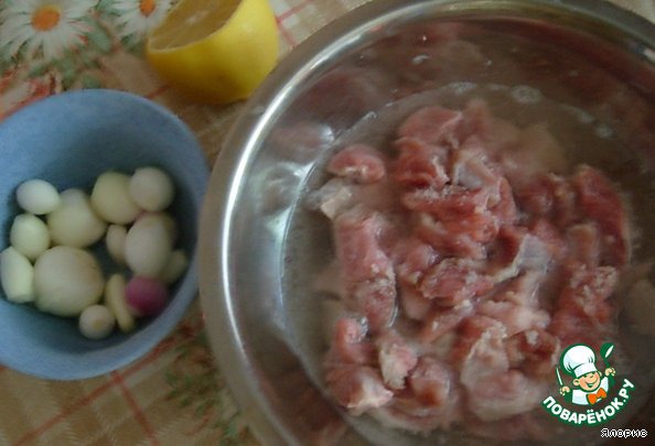 маринуем его с мелкими луковичками, приправами, солью, минеральной водой и лимонным соком в холоде около часа. За идею с минеральной водой для маринада огромное спасибо Ане(Яркая).