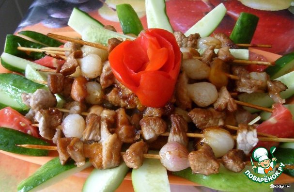 | Свиные маленькие шашлычки, пожаренные с абрикосами - хороший вариант закуски, когда накормить-то народ надо, но подозреваешь, что в такую жару особенно никто есть не намерен. Стол украшают, животы радуют!!! |
