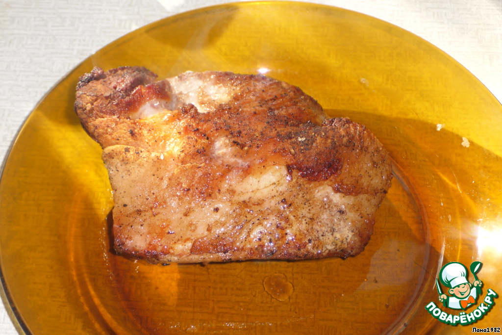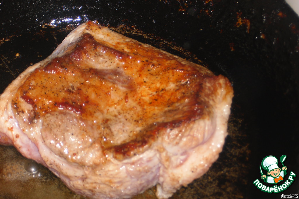Затем мясо посолить и обжарить на смеси растительного и сливочного масла до румяной корочки.
