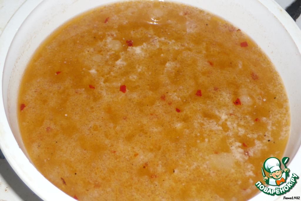 Теперь делаем соус. В кастрюлю наливаем куриный бульон, добавляем горчицу, хрен и соус чили (его можно заменить соусом Тобаско или жгучем перцем). Когда соус закипит, добавляем сливки и прогреваем до легкого загустения.