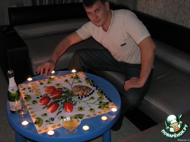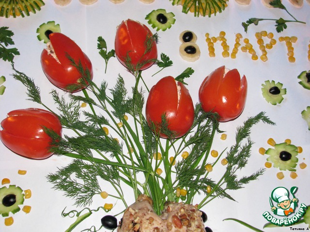 | Это блюдо - настоящий подарок весны. Муж приготовил его к празднику 8 марта. И, как он объяснил: "моя фантазия выходит за границы тарелки", то он оформил ее в виде вот такой открытки к празднику. Было даже немного жалко есть такую красоту. Это был самый лучший подарок к 8 марта. Так что, мужчины, рекомендую!!! Этот рецет отлично подходит к конкурсу "Весна в сердце". |