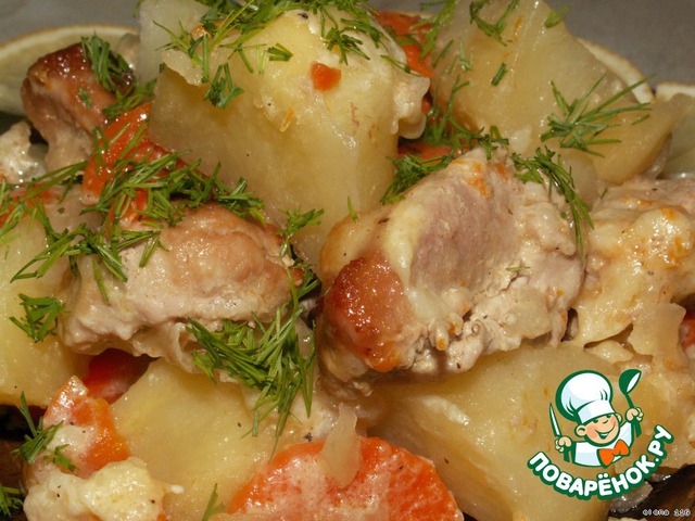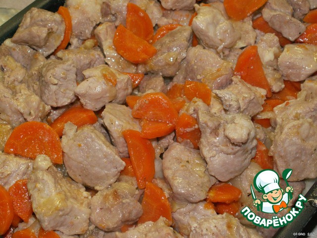 Сверху на картофель выложить свинину с овощами (прямо горячую), оставив жидкость, получившуюся в процессе тушения в сковороде.
