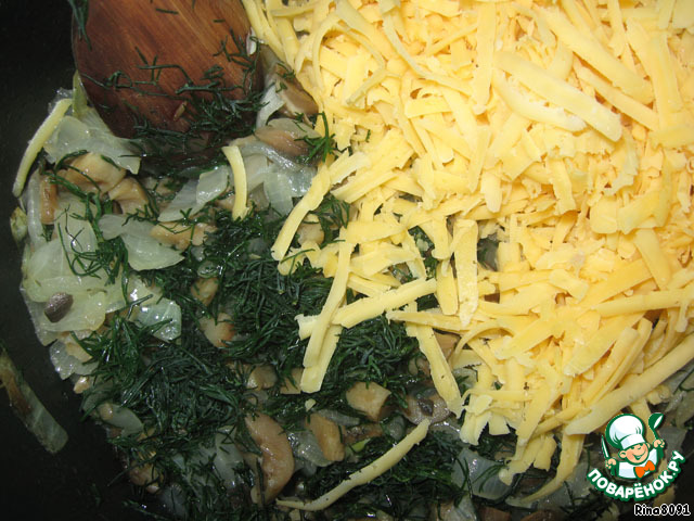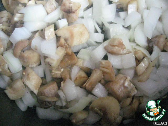 Грибы помыть, мелко нарезать. Лук так же мелко нарезать. Обжарить в небольшом количестве растительного масла, посолить, поперчить, по желанию можно добавить немного измельченного чеснока. (в оригинале рецепта - грибы нужно отваривать, но на мой взгляд - обжаренные вместе с луком грибы намного вкуснее и ароматнее).
