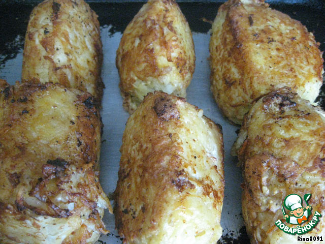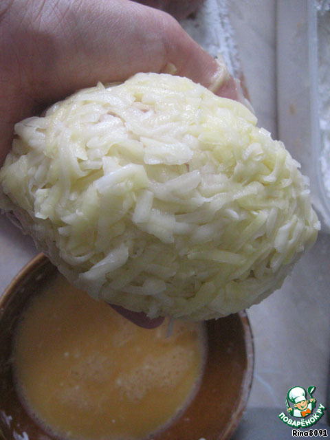 Только после того, как котлеты сформированы (это важно!), приступаем к терке картофеля - чтобы масса не потемнела, от "долгого ожидания". Я использовала крупную терку. Отжать лишнюю жидкость, добавить 2 яйца, соль, перец, хорошо перемешать. Котлету обвалять в муке, затем во взбитом яйце и, сложив руки "лодочкой" равномерно по всей котлете разложить картофельную массу, плотно прижимая руками (желательно делать это над раковиной или какой-то емкостью - так как с картофеля будет отжиматься излишняя жидкость).