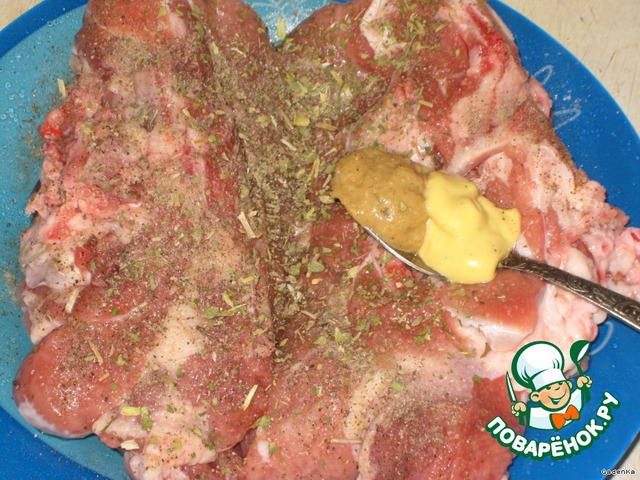 Смазать свинину двумя видами горчицы, чуть посолить, поперчить, добавить прованские травки, все хорошо втереть руками в мясо и убрать мясо в холодильник на 4-5 часов минимум, можно на ночь. Горчицу можно взять одну, обычную, 1 ч.л., у меня было две, ну я и взяла сразу две, это не принципиально сколько, главное чтобы хоть одна, да была))