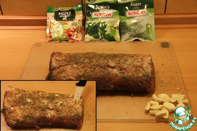 Чеснок 4 зуб. - режeм каждый на 4 части, накалываем ножом мясо на глубину 2 см и вталкиваем туда чеснок.