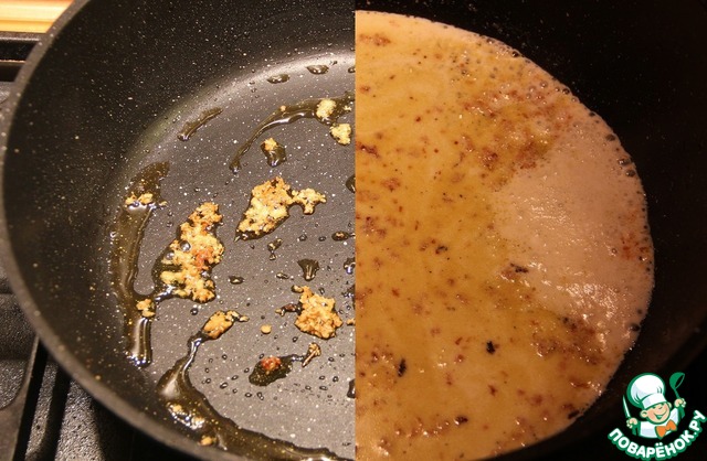 Убираем мясо со сковороды, продавливаем и обжариваем оставшийся чеснок. Заливаем молоком и доводим до кипения. Выключаем.