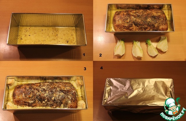 Выкладываем обжаренную свинину и заливаем оставшимся молоком. Четвертуем фенхель и вставляем по углам. Хорошо накрываем фольгой.