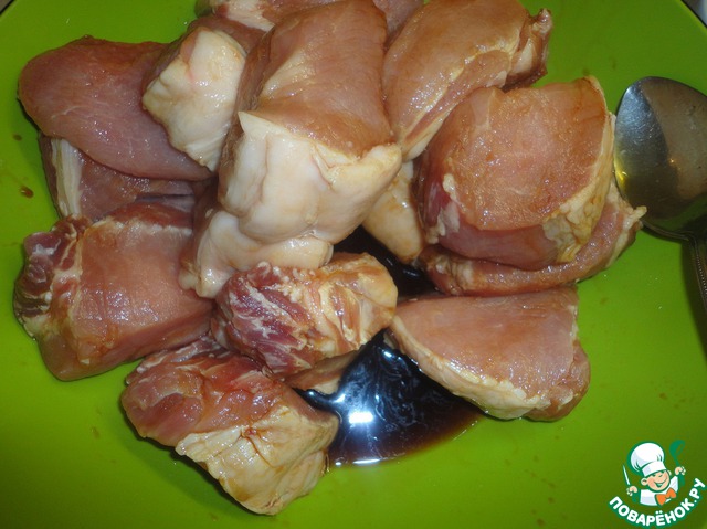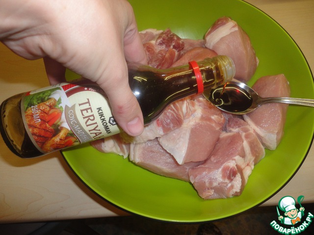 Складываем мясо в удобную посуду, добавляем 10 ст. л. соуса-маринада "Kikkoman", хорошо перемешиваем и оставляем на 1 час при комнатной температуре.